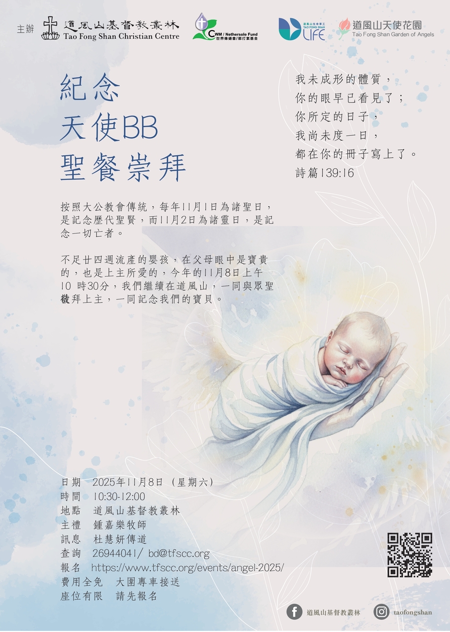 不足廿四週流產的嬰孩,在父母眼中是寶貴的,也是上主所愛的,今年的11月8日上午10時30分,我們繼續在道風山,一同與眾聖徒敬拜上主,一同記念我們的寶貝。
